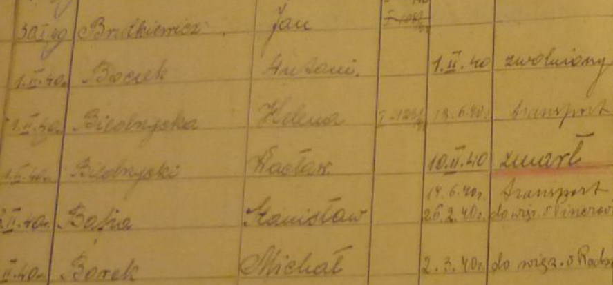 Skorowidz więźniów z 1940 r. W trzecim i czwartym wierszu widnieją nazwiska Heleny i Wacława Biedrzyckich (Źr. foto OMPiO)