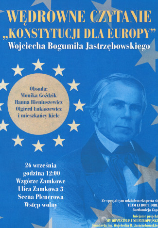 Zapraszamy mieszkańców Kielc, 26 września o godz. 12.00 na Wzgórze Zamkowe, ul. Zamkowa 3 na „Wędrowne czytanie Konstytucji dla Europy Wojciecha Bogumiła Jastrzębowskiego”. Na scenie wystąpią Monika Goździk, Hanna Bieniuszewicz, Olgierd Łukaszewicz i mieszkańcy Kielc oraz ekspert sieci Team Europe Direct Bartłomiej Zapała. Patronat nad wydarzeniem objęła Prezydentka Miasta Kielce – Agata Wojda.