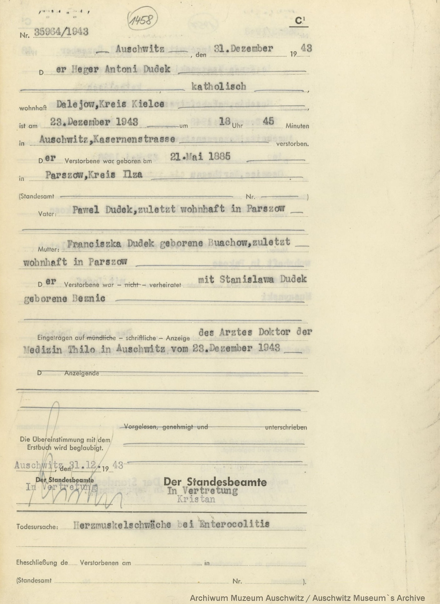 Antoni Dudek zginął 23 grudnia 1943 r. na terenie wspomnianego obozu koncentracyjnego. Oficjalną przyczynę śmierci stanowiła niewydolność mięśnia sercowego przy martwiczym zapaleniu jelit. Jego symboliczny grób znajduje się na cmentarzu parafialnym w Suchedniowie.