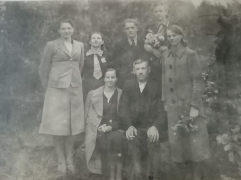 Fotografia z lat 30-tych ukazująca uczestników bliżej nieokreślonej uroczystości. Wśród nich, Antoni Dudek (prawy górny róg), jego córka Helena (czwarta od lewej w pierwszym rzędzie) oraz znajdujący się za nią syn Józef. Przypuszczalnie, w prawym dolnym rogu widoczna Stanisława Pawełczyk – córka gajowego Franciszka Pawełczyka (Źr. foto – zbiory rodzinne p. Darii Laubscher)