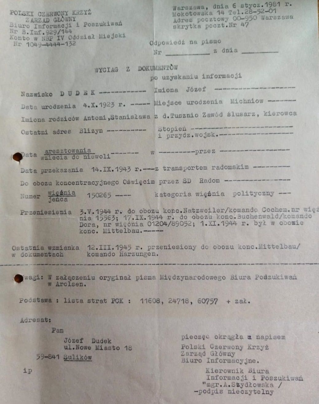 (1) – Zachowana dokumentacja z uwięzienia w KL Buchenwald i KL Mittelbau (2) – Dokument PCK świadczący o aresztowaniu i pobycie w obozach koncentracyjnych (3) – Ślub Jadwigi i Józefa Dudków – Sulików 1953 r.